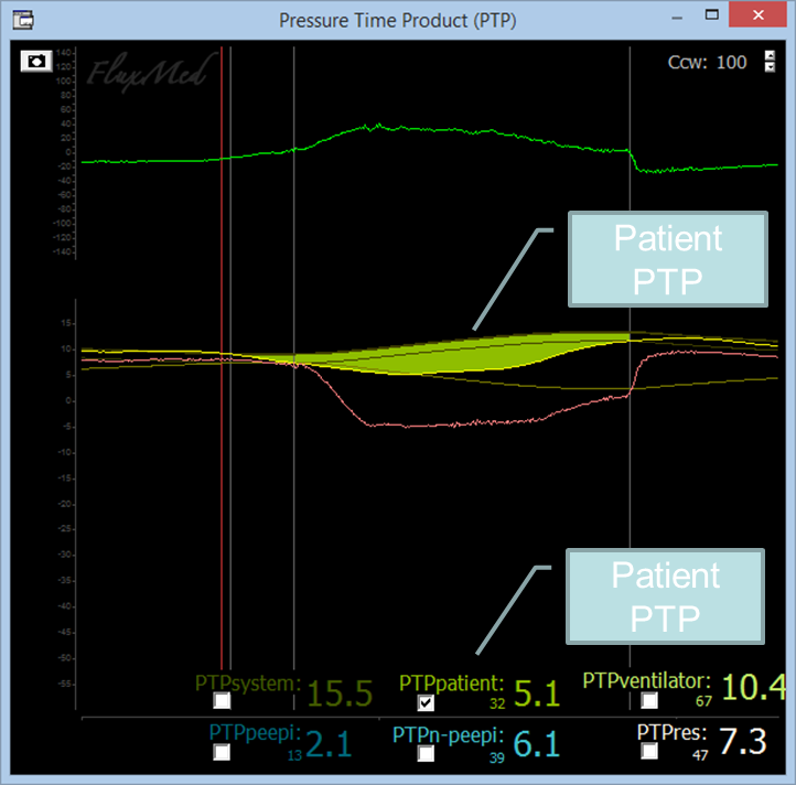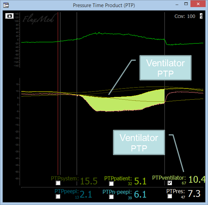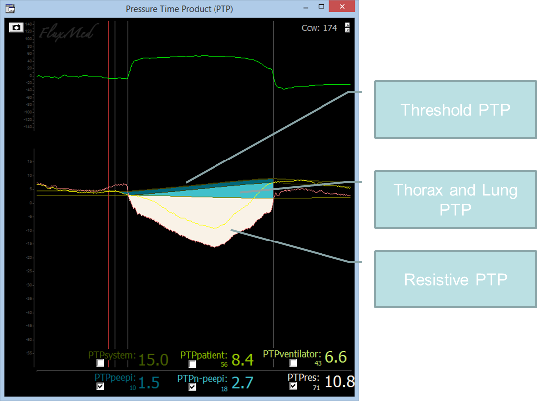 The Pressure-Time Product (PTP) diagram allows you to quantify and visualize every component of the equation of motion: Paw + Pmus = PEEPi + E.V + R.F where: